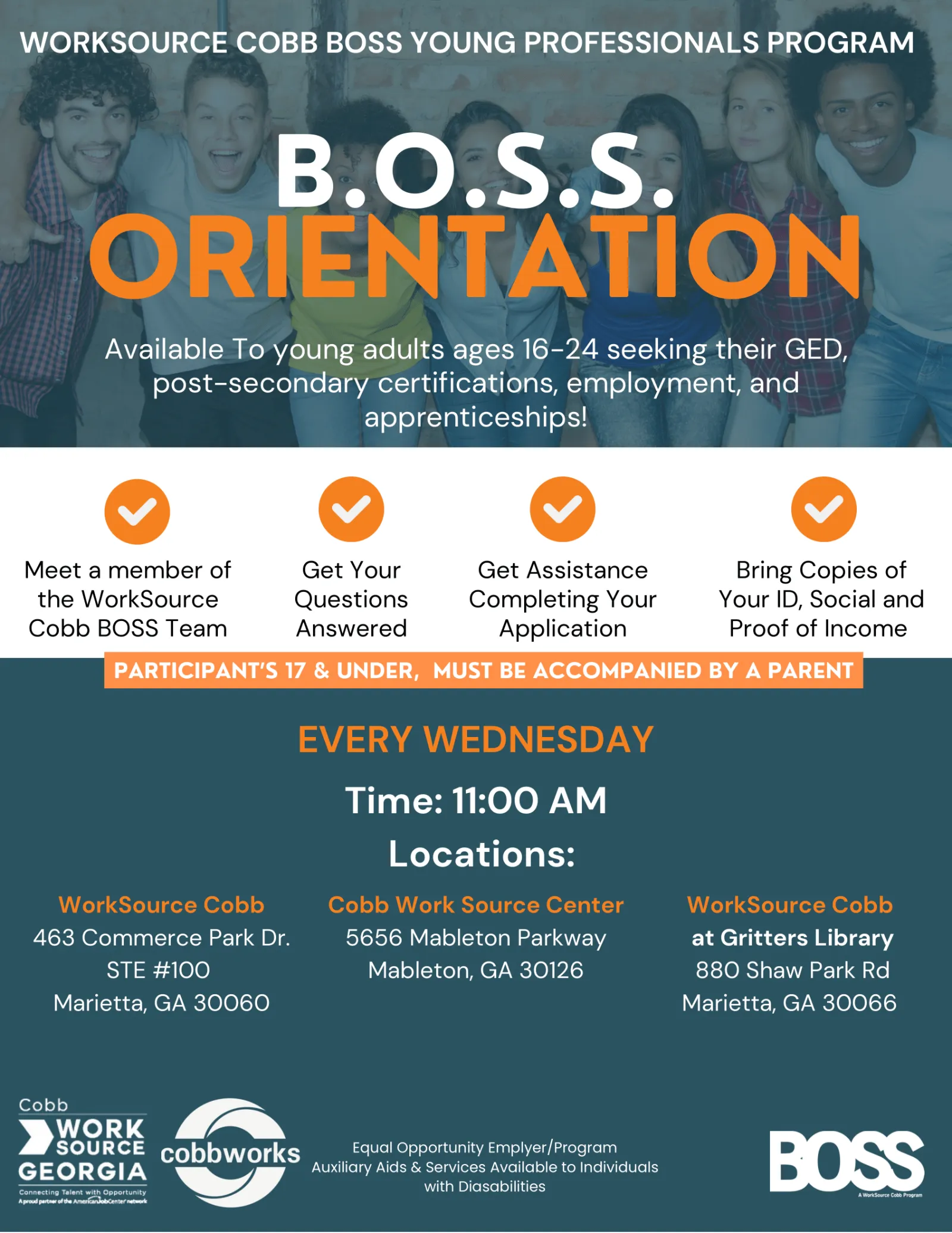 Join us in person for Young Adults and GED Orientation every Wednesday at 11:00 AM. Sessions begin promptly at 11:00 AM with no exceptions.