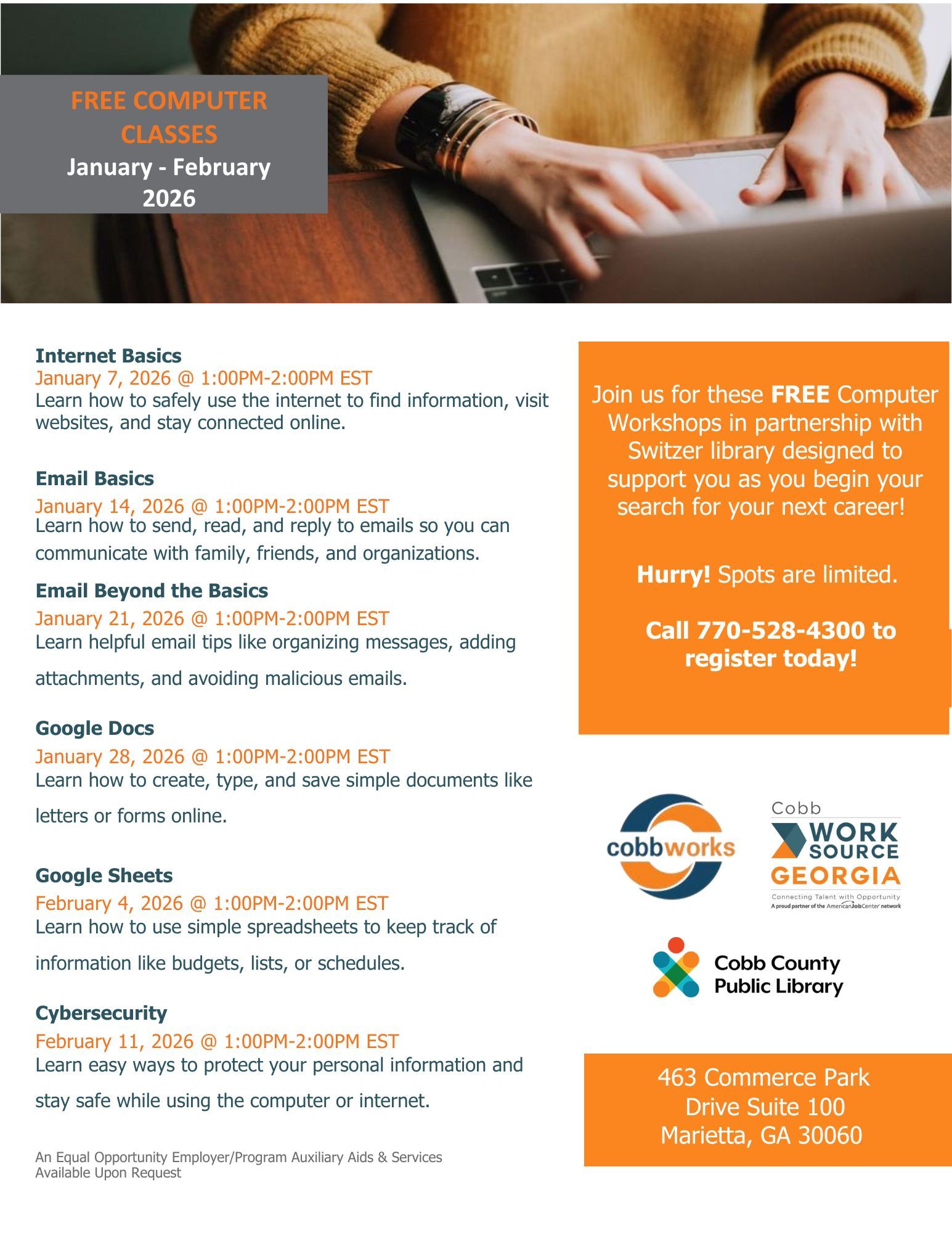 CobbWorks is hosting FREE computer workshops in partnership with Switzer Library. These classes are designed to help you learn basic computer skills and support your job search.